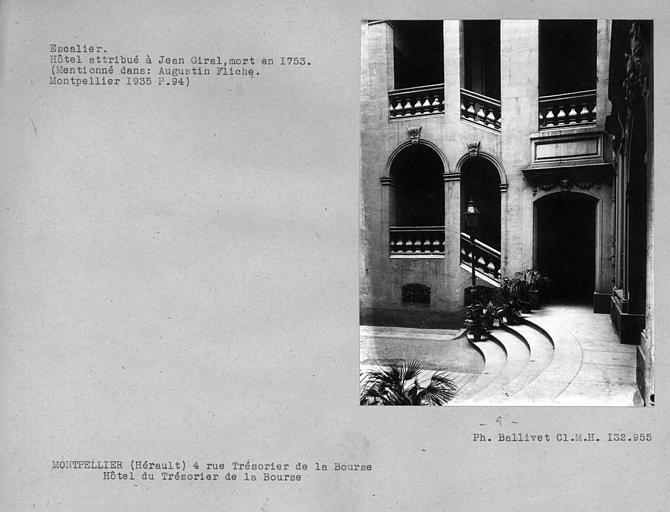 Cet hôtel existait avant le 18e siècle, mais l'édifice a été complètement remanié, agrandi et embelli par l'architecte Jean Giral, pour le compte du trésorier de la Bourse, Bonnier de la Mosson, qui acquit l'immeuble en 1712. Le corps de bâtiment situé entre les deux cours aurait été achevé en 1700 ; l'escalier d'honneur en 1731. Il ne resterait des constructions du 17e siècle que le petit escalier à droite de la cour d'honneur. L'entrée se fait par une porte à l'encadrement en pierre, avec refends, couronné par une corniche. La clef du chambranle est sculptée en perspective. Cette porte donne accès à la cour d'honneur en passant sous un porche voûté. Un dallage en cailloux roulés borde la cour et le porche et encadre, au centre, un chemin en dalles de pierre qui aboutit à un emmarchement au fond. Une porte à fronton cintré, avec motif sculpté, conduit par une galerie à la seconde cour de l'immeuble. A gauche dans la cour d'honneur se trouve le grand escalier. Les balustrades rampantes se composent d'éléments compris entre les piliers extérieurs et intérieurs qui supportent le limon au moyen d'arcs rampants. Des pilastres d'ordre corinthien sont adossés aux piles intérieures et leurs chapiteaux ne supportent rien.