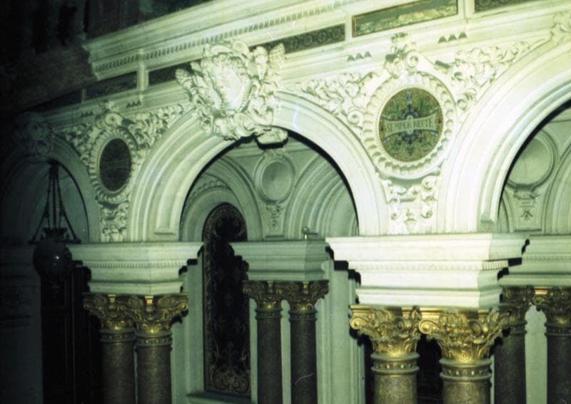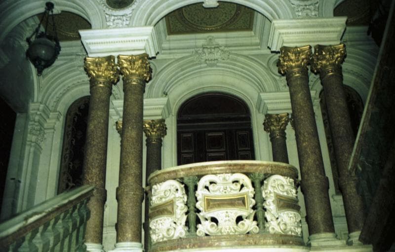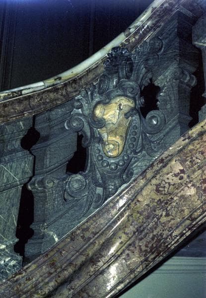 L'immeuble conserve à l'intérieur un escalier Second Empire, aussi remarquable par la richesse de ses matériaux (marbre, onyx, mosaïque à fond d'or) que par ses dimensions. Il est précédé d'un étroit vestibule voûté dont les niches surmontées de coquilles contiennent de grands vases en marbre. La cage d'escalier se compose d'un grand escalier à volées droites et de deux galeries superposées. Les trois arcades du rez-de-chaussée reposent sur des piliers ornés de mosaïque à fond d'or. L'arcade centrale est décorée d'un masque d'homme à la clef. Les arcades du premier étage retombent sur des colonnes jumelées en marbre rouge à chapiteaux corinthiens dorés. Au centre de cette galerie, une petite loggia en demi-cercle est agrémentée d'une balustrade en marbre vert. Dans les écoinçons des arcades sont logés des médaillons de mosaïque. L'arcade centrale est ici décorée d'un masque de femme. Cette colonnade est reprise, à l'arrière, sur le mur et les colonnes jumelées encadrent la porte d'entrée d'un appartement. De part et d'autre de ces colonnes, le mur est recouvert de velours cramoisi brodé. L'escalier est à volées droites et utilise de riches matériaux : main courante en onyx, limon en marbre rouge, balustre en marbre vert. Cet ensemble, manifestement inspiré par l'Opéra de Paris, est un excellent exemple d'architecture Napoléon III.
