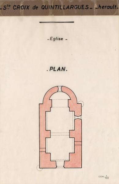 Dépendance de l'abbaye d'Aniane, Sainte-Croix de Quintillargues formait, avec Fontanès, une paroisse du diocèse de Maquelone. L'église a été consacrée en 1138. Endommagée au cours des guerres de Religion, c'est sans doute à la suite de ces dégradations que fut remontée la voûte de l'édifice et que son couvrement extérieur fut adapté à la défense, notamment avec la construction des deux échauguettes. L'édifice présente le plan habituel des petites églises romanes de la région : une nef unique terminée par une abside en hémicycle. L'entrée actuelle s'effectue par la façade ouest. Il existe deux portes murées, surmontées d'un petit arc de décharge et s'ouvrant toutes deux dans la première travée de la nef, sur les flancs nord et sud. La porte nord faisait sans doute communiquer l'église avec les bâtiments du prieuré attenant. A l'intérieur, primitivement, la nef ne présentait pas de division en travées, mais sans doute à l'occasion du remplacement de la couverture en charpente par une voûte, furent élevés de forts piliers engagés soutenant des doubleaux, divisant ainsi la nef en deux travées. De plus, on lança contre les murs latéraux des arcs de décharge en berceau brisé, retombant sur les pilastres par l'intermédiaire de consoles. Ces transformations datent sans doute d'une période indéterminée du 12e siècle. Il n'est cependant pas possible de savoir si la voûte élevée à cette époque était en plein cintre ou en berceau brisé. La voûte actuelle, en berceau brisé surbaissé, date de la réfection tardive due aux guerres de Religion.