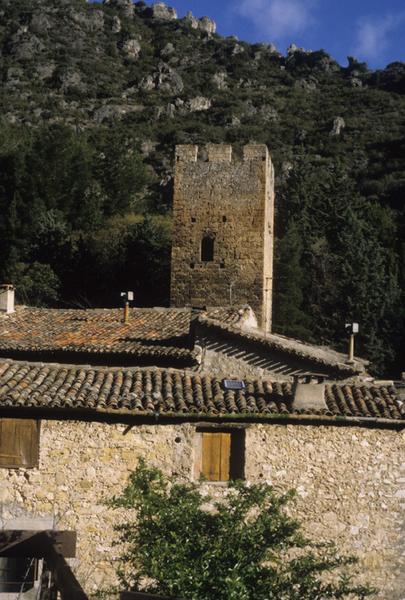 Dans la tradition locale, cette tour est connue sous le nom de "tour des prisons" sans que l'on sache exactement à quand remonte son utilisation comme geôle. L'ouvrage, au moins à sa base, est roman et paraît dater, par certains détails, du début du 12e siècle. Par la suite, l'ouvrage fut repris et surélevé, percé de nombreuses archères et couronné de merlons. Il servit ensuite de grange. L'édifice se présente comme une tour carrée, haute d'environ quatorze mètres. L'accès se fait par une ruelle montante donnant, à gauche, sur une cour intérieure autrefois fermée par une porte dont l'arc subsiste. Le portail d'entrée, moderne, laisse voir une partie de l'ancienne porte romane en plein cintre qui comportait un tympan demi-circulaire plein. Cet élément est assez caractéristique pour pouvoir rapporter la base de l'édifice au 12e siècle. A partir de la moitié de sa hauteur, la tour présente un appareil plus grand et plus soigné qu'à la base.