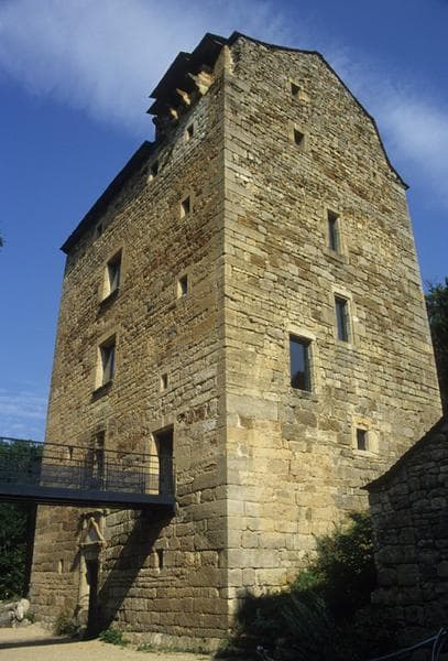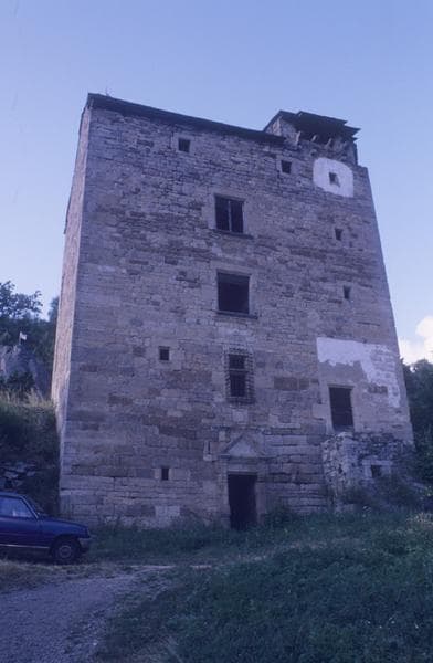 Il s'agit sans doute des vestiges d'un ancien donjon médiéval ainsi qu'en témoignent la disposition intérieure des différents étages, les vestiges de niches en plein cintre et les restes d'appareil défensif. La tradition orale rapporte l'existence d'un château féodal. Sur cette construction, un parement de pierres taillées a été plaqué en 1593. Des aménagements ont ensuite été réalisés aux 17e-18e siècles. L'élément le plus intéressant est la porte monumentale du premier niveau. Dans un style Renaissance très pur, l'architecte y a résumé la grammaire de l'architecture classique. Les piedroits sont ornés de deux pilastres lisses à base haute, orné chacun d'un chapiteau ionique supportant un fronton triangulaire. Le fronton est lui-même surmonté d'une corniche qui conclue l'ensemble. La disposition intérieure se fait selon cinq niveaux, chacun composé de deux pièces principales. Cheminées monumentales et vestiges de peintures. Le plafond du quatrième niveau conserve une décoration de moulures sculptées. Le cinquième niveau, étage sous comble, est occupé par un pigeonnier et présente, dans l'angle sud-est, les vestiges des parties hautes d'une construction antérieure.