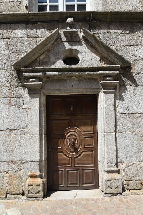Porte constituée par deux pilastres reposant sur des socles ornés d'un losange à grand axe horizontal. Ces pilastres sont unis, assez élancés et proches de l'ordre dorique. Deux pierres taillées en têtes de diamant à facettes raccordent les pilastres et le fronton triangulaire. Le fronton mouluré est brisé à sa partie supérieure pour encadrer un motif décoratif terminé par une boule. Au milieu du fronton est percée une ouverture ovale munie d'un chanfrein s'élargissant vers le haut pour permettre à plus de lumière d'éclairer l'intérieur. Le linteau est droit et monolithe. La menuiserie en chêne est la copie de celle qui existait antérieurement. Elle est à panneaux et petit cadre vers l'extérieur. Un panneau oval est placé en son centre, au milieu duquel se trouve le bouton.