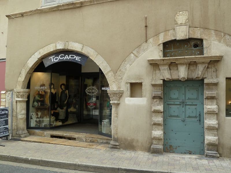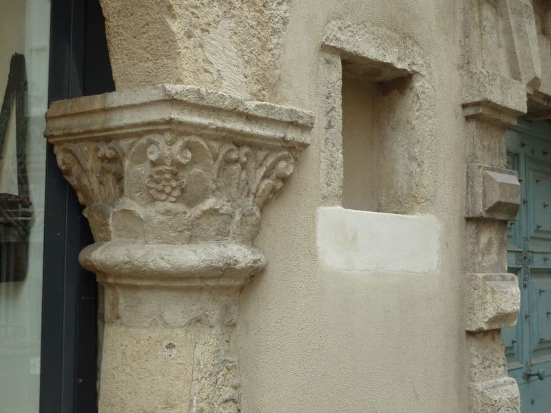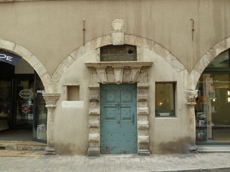 Porte en calcaire de Mende, à plate bande en pierre appareillée. Elle est constituée par des bossages intercalés avec des parties plates, et surmontée d'une corniche. Au-dessus se trouve une ouverture composée de deux jambages et d'un arc tendu pour l'éclairage du couloir.