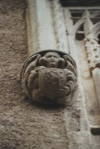 La façade sur la rue est élevée de deux étages sur rez-de-chaussée et ayant conservé quelques éléments anciens. Le rez-de-chaussée possède trois parties d'encadrements moulurés, du type à nervures entrecroisées aux angles. Le premier étage était percé d'une fenêtre munie d'un encadrement saillant reposant, à droite, sur une console sculptée. Cette fenêtre est surtout remarquable par son pilier d'angle à colonnettes, sculpté sur deux faces. L'arête de la façade était ornée sur toute sa hauteur, d'abord à la base par une colonnette en boudin à chapiteau circulaire, puis par le pilier d'angle sculpté du premier étage, enfin par une colonnette à l'étage supérieur. Le deuxième étage conserve deux grandes fenêtres à meneaux croisés. Identiques, ces deux baies se caractérisent par leurs moulurations torses entrecroisées, sur bases à talons semblables à celles du premier étage.
