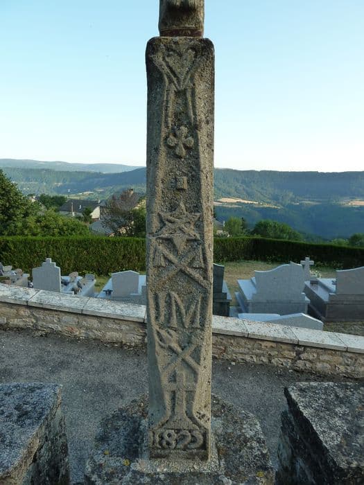 Croix en calcaire, de section octogone. Le centre du fût est occupé par un écu composé de trois besaces. Le pied est à conges gothiques. Le tout est porté sur une forte base. Cette croix peut être datée entre 1600-1620. Le croisillon paraît postérieur au reste.