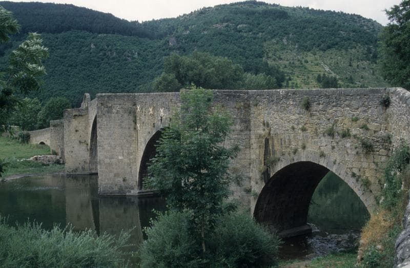 Selon la légende, un agriculteur aurait découvert, au début du 11e siècle, une statue miraculeuse de la Vierge en labourant son champ. Une première église aurait été bâtie à cette époque. Le premier document mentionnant l'église date de 1365. La dévotion à la Vierge attire de nombreux pélerins. Au 14e siècle, des indulgences sont accordées pour la construction d'un pont facilitant l'accès aux pélerins.En 1626, la seconde arcade du côté nord tombe dans la rivière et n'est rétablie qu'en 1633. En 1657, la grande arcade tombe à son tour et est reconstruite deux ans plus tard. Au 18e siècle, le pont étant dégradé, la reconstruction est envisagée mais retardée par plusieurs chutes de l'ouvrage au cours des travaux, emporté par la rivière. L'ouvrage est achevé en 1738. Le pont est formé de six arches, une grande, deux moyennes, deux petites et une plus petite. Les piles intermédiaires sont protégées par des avant-bras bâtis en appareil. La seconde pile, côté rive gauche, portait une petite chapelle.