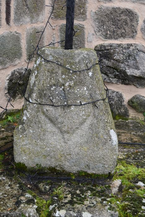 Croix en fer forgé à quatre rangs d'arcs épineux. Trois tenons étaient destinés à recevoir des lanternes. Des tigelles à anneaux émergent des feuilles et devaient recevoir des chaînes qui réunissaient les bras. Le Christ et la Vierge sont abrités sous un auvent en forme d'abat-voix. Une inscription gothique occupe le pied de la croix et son dernier tiers.