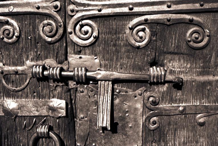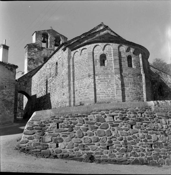 Orientée à l'est, l'église comporte une nef unique et une abside demi-circulaire extérieurement décorée d'arcatures. Une chapelle latérale a été tardivement construite au nord et une sacristie y a été ajoutée plus récemment. Entre la nef et l'abside s'intercalle un rappel de choeur correspondant à l'arc triomphal. Le mur ouest est surmonté d'un clocher-arcade à deux baies, l'étage supérieur en retraite. Refaite en 1736 et 1867, la porte occidentale a conservé, ou reçu en réemploi, des vantaux anciens munis de ferrures. Chaque vantail est décoré de trois pentures à spirales symétriques, assujetties par des clous à tête ronde. De simples fers plats complètent cet assemblage.