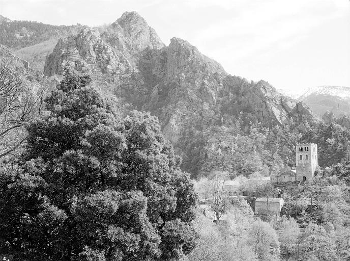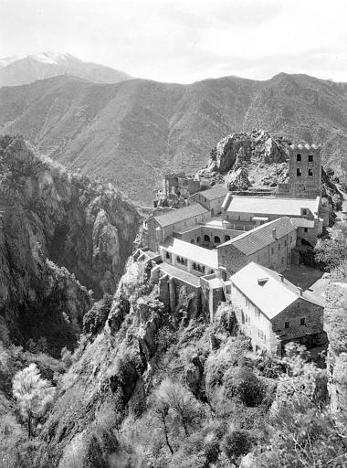 Au 10e siècle s'élevait une église dédiée à saint Martin, qui devait être le but d'un pèlerinage. Au 11e siècle, Guifred II, comte de Cerdagne et de Conflent, sa femme et sa mère firent de riches dons à cette église. Le comte voulut y installer des moines bénédictins et fit des dons pour la construction du monastère. Une colonie de Cuxa se rendit au Canigou. L'église du monastère fut consacrée en 1009. Par une bulle de 1011, le Pape reconnut que l'abbaye relevait du Saint Siège. En 1014, le comte y fit mettre les reliques de saint Gaudérique, prises à Toulouse. Une chapelle spécifique fut bâtie à côté de l'église. Quittant sa famille, le comte vécut à l'abbaye à partir de 1043 et y mourut en 1049. Les guerres du 14e siècle stoppèrent la prospérité de l'abbaye. En 1428, un tremblement de terre renversa le clocher de l'église. Peu avant la Révolution, les moines quittèrent l'abbaye après avoir demandé leur sécularisation en 1779. Bâtiments claustraux et église furent alors utilisés comme carrière par les habitants des environs. Au début du 20e siècle, monseigneur de Carsalade du Pont, évêque de Perpignan, entreprit de relever les ruines et d'y ramener ce qui avait été éparpillé. ££Sous la tour du clocher, accolée à la façade nord de l'église, se trouve l'entrée menant à une cour. D'un côté de cette cour s'élève l'église ; de l'autre, au pied d'un mur moderne, se trouve le tombeau de Guiffred. Le cloître est placé de l'autre côté de l'église, accolé à sa façade sud. L'église se compose d'une nef centrale et de deux bas-côtés. Chacun de ces vaisseaux se termine à l'est par une abside sans choeur. Les six travées sont successivement délimitées par deux paires de colonnes, une paire de piles cruciformes et deux autres paires de colonnes. Les trois voûtes sont en berceau, la centrale étant plus élevée. Les chapiteaux sont couverts d'une ornementation plate romane (animaux, feuillages, moulures). Seul le grand chapiteau de marbre qui supporte la table du maître-autel a été sculpté en relief (scènes de la vie de saint Martin). La crypte de saint Martin se présente comme une église inférieure dépassant, côté ouest, l'aplomb de la façade. Les travées y sont deux fois plus nombreuses que dans l'église supérieure. La tour du clocher, accolée à la façade nord de l'église, est carrée et se dresse sur trois étages. Au rez-de-chaussée se trouve le passage d'entrée de l'abbaye. Au-dessus de la porte orientale du couloir ressort une petite absidiole qui rappelle l'usage de placer un autel dans les tours. Au premier étage s'ouvrent deux fenêtres cintrées, surmontées d'arcatures. Le second étage comporte quatre fenêtres cintrées, unies deux par deux par de petites colonnettes. Le tremblement de terre de 1428 avait détruit la tour, comme la plus grande partie du monastère. Elle fut reconstruite en 1433 suivant le modèle du clocher primitif. Le cloître a pratiquement été refait au début du 20e siècle, à partir des éléments récupérés. Il dessinait en plan un quadrilatère irrégulier et comportait deux étages construits à des époques différentes. La partie inférieure remontait aux premiers temps de l'abbaye (11e siècle). Plus tard furent construites les galeries supérieures, avec colonnettes et chapiteaux en marbre. La galerie nord s'appuyait contre l'église ; celle de l'ouest contre les bâtiments renfermant la salle capitulaire ; celle de l'est, à la maison abbatiale. La galerie sud pouvait donner sur la gorge. Les galeries n'étaient pas voûtées mais simplement recouvertes d'un appentis. Faisant suite à l'église souterraine, une terrasse encadrait autrefois un second cloître.