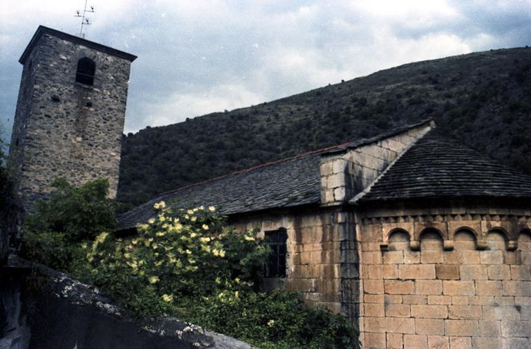 La première mention de l'église date de 1175. L'architecture, l'appareil mis en oeuvre, le décor lombard et le caractère de l'inscription gravée sur le linteau de la porte, attestent d'une construction caractéristique du 12e siècle. L'édifice est à nef unique et chevet semi-circulaire. L'ensemble, hormis le parement extérieur du mur de fond de la nef, est en marbre ocré. Mur goutterot nord et chevet sont couronnés par un rang d'arcatures lombardes monolithes sur modillons, surmonté d'une frise de dents d'engrenage. La porte d'entrée présente un linteau supportant un arc plein cintre à l'intérieur duquel s'inscrit, en retrait, un tympan monolithe nu. A l'intérieur, la nef et la travée de choeur sont couvertes d'une seule et même voûte en berceau légèrement brisé. La travée de choeur est flanquée de deux chapelles latérales, rectangulaire au nord, semi-circulaire au sud, couverte d'un cul de four. Une tribune à balustres, aparemment du 17e siècle, occupe le fond de la nef. Une porte en arc plein cintre, ménagée dans le mur de fond, permettait la communication entre la tribune et les bâtiments aujourd'hui disparus.