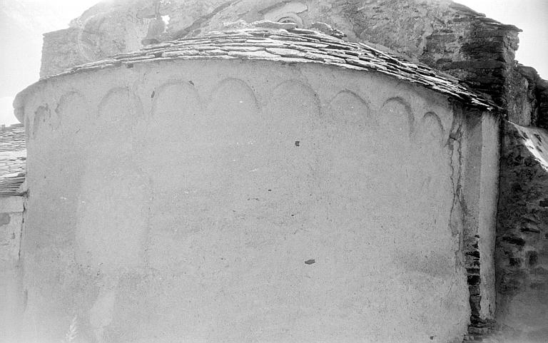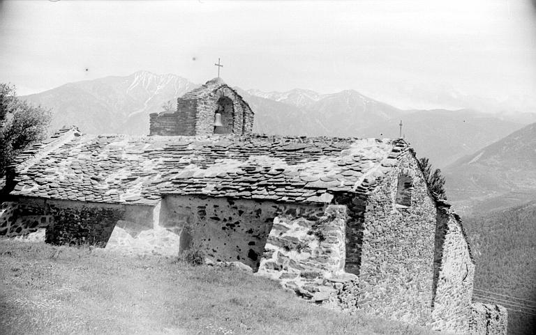 L'église est mentionnée en 1277. L'édifice se compose d'une nef unique, prolongée à l'est par une abside demi-circulaire, et s'appuyant au sud contre un clocher carré qui semble avoir été arasé à un niveau très inférieur à celui d'origine. Ce clocher a été doté d'une arcade campanaire qui pourrait représenter l'une des faces du clocher primitif. Le clocher appartient à la même campagne de construction que la nef et l'abside, bien que l'adjonction d'une église à une tour-signal plus ancienne ne soit pas à exclure. L'abside est décorée d'une arcature lombarde continue, s'appuyant aux deux extrémités sur des contreforts plats. Au-devant de la nef au sud, a été édifié un porche prolongeant l'alignement du clocher et formant une sorte de collatéral. Cette construction est ancienne, comportant une porte romane en plein cintre, à double rouleau, encore munie de ses vantaux à ferrures de type catalan. Le mur latéral nord a subi des mouvements ayant obligé, en 1951 et 1960, à construire trois contreforts talutés.