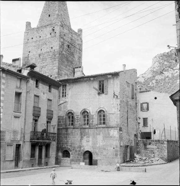 Bâtie sur plan carré, la tour beffroi semble dater, au moins dans son étage de base, des premières années de la fondation de la ville (11e siècle). Il se compose d'un grand appareil aux assises irrégulières. La porte d'entrée est encadrée de trois énormes blocs monolithiques. L'intérieur, voûté en berceau, a été aménagé en lavoir public. La partie supérieure de la tour a été couverte, à une époque récente, d'une lourde flèche, en tronc de pyramide à quatre faces, supportant un petit clocheton de fer forgé, à deux cloches superposées. Construite plus tard, la maison communale adjacente présente trois portes romanes, probablement du 12e siècle. Le bâtiment est une construction sur trois niveaux dont seuls le rez-de-chaussée et le premier étage paraissent anciens. L'immeuble servit longtemps d'hôtel de ville.