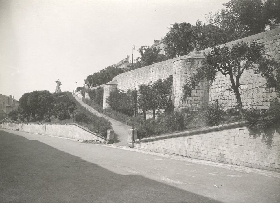 La première enceinte établie sur la crête rocheuse est encore visible au nord, près du marché couvert, situé à l'emplacement même qu'occupait l'ancien château qui protégeait la ville. Partant de ce point, le rempart suivait la falaise vers l'ouest puis se retournait au sud. Le mur de ce rempart fut construit par assises de pierre de taille, de grandes dimensions, posées à joints vifs sans mortier. Ce rempart était constitué par deux parements formant pratiquement deux murs entre lesquels avaient été entassés des débris de pierres moulurées, de fûts de colonnes, de bas-reliefs, de chapiteaux et de statues provenant de la destruction de constructions antérieures. Le parement de cette première enceinte, qui pourrait remonter au 4e siècle, laisse apparaître, à la partie supérieure des pierres, les trous ayant servi à les monter et à les mettre en place. Il subsiste en outre les restes de deux tours carrées, situées près de l'entrée du jardin public, sans doute bâties au 11e siècle pour flanquer la courtine. Au pied du marché couvert se trouvent également, dérasées, trois tours demi-cylindriques qui protégeaient les abords du château primitif. Cette première enceinte fut complétée, à la fin du 12e siècle, par une suite de remparts disposés pour envelopper le château neuf et défendre la partie orientale de la ville. Les parties subsistantes de ce dispositif laissent voir les restes de trois tours demi-cylindriques qui flanquaient ce rempart. A la fin du 13e siècle, l'importance du faubourg Saint-Martial fut jugée assez grande pour justifier sa protection. On construisit une suite de courtines et de tours demi-cylindriques qui englobaient, dans leur tracé, le champs de Mars actuel pour rejoindre l'emplacement de l'ancien château. Cette enceinte a disparu presque complètement, hormis quelques restes de courtines et de tours percées de meutrières à canons.