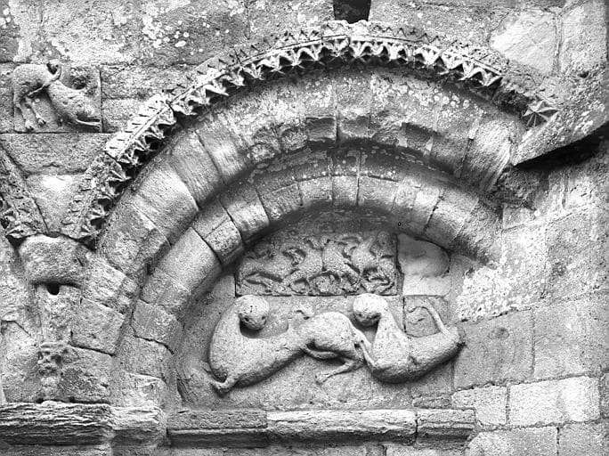 Edifice du 12e siècle, composé d'une nef avec transept, abside et absidioles. Il est surmonté d'un clocher carré. Toute la partie supérieure de la façade principale (ouest) forme pignon et a été remontée au 14e siècle, ainsi que les contreforts d'angle. La partie inférieure, du 12e siècle, est composée d'un portail à archivolte décorée, flanqué de deux arcatures aveugles dont les archivoltes sont également ornées, de même que le tympan de l'arcature droite. Au-dessus du portail règne une série d'arcatures aveugles.