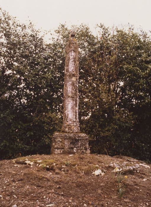 L'ouvrage est peut-être daté du Moyen Age. L'église a également reçu d'importantes modifications gothiques. Aucune partie de la croix n'est laissée sans décor sculpté. Le socle est orné de moulures. Au sommet, la croix a été rajoutée tardivement. Le fût de colonne est composé, verticalement, de quatre faces délimitées par des colonnettes ininterrompues se terminant par un pinacle. Trois niveaux horizontaux sont soulignés par de grosses moulures dont l'une est sculptée de feuillages. Au premier niveau, le décor est constitué de larges bandes suggérant des cannelures. Au-dessus, quatre personnages en robes d'ecclésiastiques ont perdu bustes et têtes. Au dernier niveau, les sculptures sont plus lisibles. Quatre personnages sont sculptés en ronde bosse dans un effet de niches, en arc trilobé, surmontés d'un gâble flamboyant.