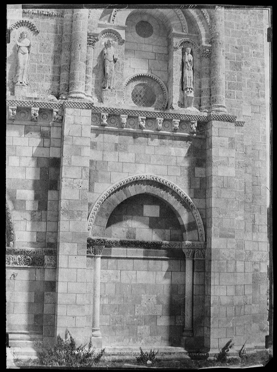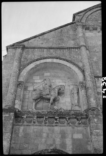 La façade, intacte, se compose au rez-de-chaussée de trois arcades, celle du centre servant d'entrée. Elle s'orne de colonnes et d'archivoltes enrichies de figures et de feuillages. Ces trois arcades sont surmontées d'un bandeau à consoles dont les intervalles sont remplis par des rosaces. Entre chacune de ces arcades s'élève, jusqu'à hauteur du premier bandeau, un pilastre saillant qui sert de base aux colonnes ornant la partie supérieure de la façade. Les deux colonnes du centre portent un grand arc qui décore le sommet du pignon. Au-dessus de la porte d'entrée se trouve une croisée à colonnes, accompagnée de deux statues nimbées. Dans les deux autres entre-colonnes se trouvent deux arcs dont l'un porte deux figures et renferme un second arc dont le fond est percé de deux oculi. L'arc du côté nord contient un cheval portant un cavalier. A l'intérieur, la nef est voûtée en berceau, de même que les bas-côtés. Un seul bras du transept appartient à la construction primitive. L'autre bras ainsi que le choeur remontent à la seconde moitié du 15e siècle. Le clocher est placé à l'extrémité nord du transept. C'est une tour carrée dont le dernier étage est percé, sur chaque face, d'une fenêtre à lancettes géminées.