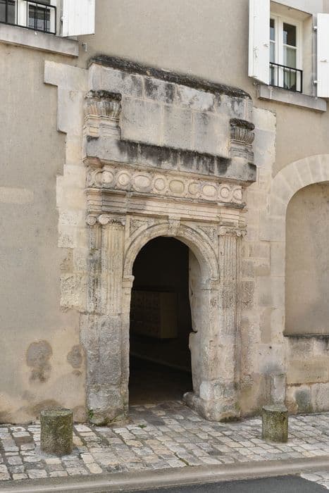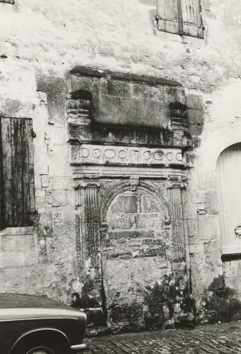 Le bâtiment auquel appartient cette porte était l'ancien hôtel de ville de Cognac pendant la majeure partie du 18e siècle. Il est situé dans la rue qui était alors, d'après la tradition, celle des familles les plus fortunées de la ville. Cette ancienne porte du 17e siècle présente deux ressauts en saillie du mur. Deux pilastres cannelés très plats, doublés chacun d'un second, tous deux avec chapiteau ionique, encadrent un arc plein cintre mouluré, à la clef formée d'un claveau très saillant en forme de console ornée d'une palmette. Dans les écoinçons formés par l'arc et les pilastres se trouvent des feuillages. La partie supérieure formant les pilastres présente une frise ornée de deux entrelacs inégaux. Cet entablement supportait un fronton en saillie sur le mur aux extrémités duquel se trouvent des pots à feu doublés.