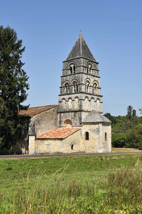 Edifice du 12e siècle, agrandi au 15e siècle d'une seconde nef de même dimension. L'église romane comporte, à l'est, un choeur demi-circulaire, voûté en cul de four, relié à la nef par un carré voûté en coupole par une calotte reposant sur des trompes. Au-dessus de cette coupole s'élève le clocher qui se compose de trois étages dont les deux supérieurs sont ajourés par des arcatures et l'étage inférieur orné d'arcades aveugles. Les arcatures du deuxième étage ont été maçonnées au 18e siècle. Primitivement, la nef romane était voûtée par un berceau plein cintre, voûte démolie au 15e siècle pour être remplacée par des arcs d'ogives. Le mur sud est percé de baies tandis que celui du nord ne comporte qu'une meurtrière. A l'extérieur, le chevet est polygonal. Le mur nord extérieur est renforcé par des arcatures en arcs brisés reliant les contreforts, suivant la technique utilisée dans la région au début du 12e siècle.