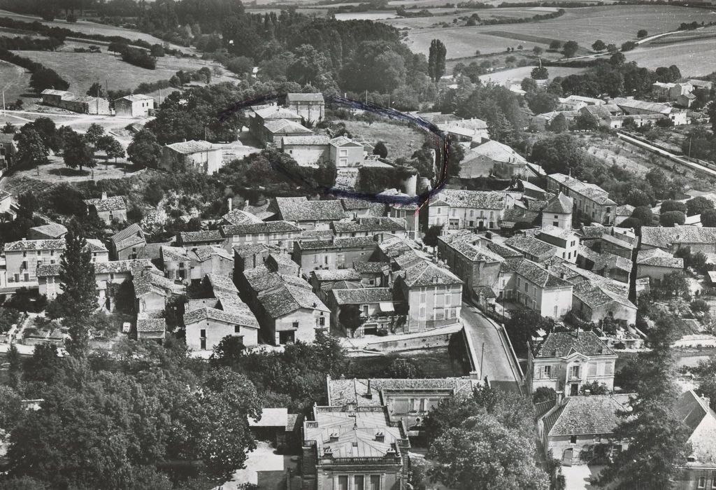 Le château fut construit par le comte d'Angoulême, Guillaume II Taillefer, qui mourut en 1018 et qui, pour cette construction, employa les matériaux provenant de la démolition du château d'Andone qu'il avait ruiné. Au 12e siècle, Vulgrin II Taillefer construisit remparts et donjon. Pendant la guerre de Cent ans, le territoire et la châtellenie furent ravagés à plusieurs reprises. Le donjon, construit avant 1140, est une tour rectangulaire renforcée de contreforts. Cette tour a été tronquée. A l'ouest a été adossé, plus tard, une tour polygonale tronquée. Un linteau de porte avec accolade du 15e siècle, indique les transformations exécutées plus tard. Il ne reste pas de trace de fossés à proximité de la tour. L'enceinte, de forme irrégulière, est rasée à hauteur du sol qui porte le donjon. Au sud, elle présente une porte d'entrée flanquée de deux tours cylindriques tronquées. Construite avant l'emploi des ponts à bascule, cette porte a l'apparence du 13e siècle. Vestiges de tours cylindriques et de rempart à l'ouest de cette porte.