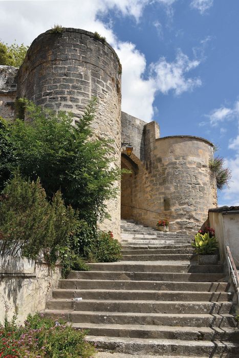 Les restes du donjon rectangulaire ; la porte de l'enceinte y compris les deux tours qui l'encadrent (cad. C 1028) : inscription par arrêté du 28 mai 1962