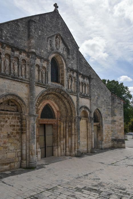 La façade s'ouvre par un portail composé de trois archivoltes aux contours sculptés. De chaque côté de ce portail, et séparé par un pilastre cylindrique montant jusqu'au sommet de la façade, se trouve une arcade plein cintre aux contours sculptés, avec tympan uni et en arrière formant niche. Dans la niche de droite, le motif sculpté a disparu. Dans la niche de gauche, est représenté un lit richement orné sur lequl repose un être humain avec, sur le pied du lit, un quadrupède qu paraît avoir une tête humaine. Au milieu et au-dessus des archivoltes du grand portail, se trouve une fenêtre de grande dimension. De chaque côté de cette fenêtre, une galerie se compose de six niches plein cintre sculptées et moulurées. Ces niches ont pour la plupart conservé leurs statues (douze apôtres). Le tout est encadré par deux autres pilastres cylindriques qui s'élèvent également jusqu'au sommet de l'édifice. Dans le pignon, au sommet de la façade, un médaillon représente le Christ debout avec, de chaque côté, deux anges debout.