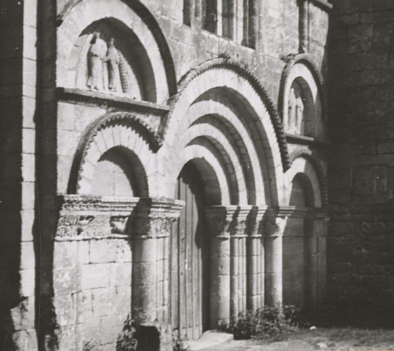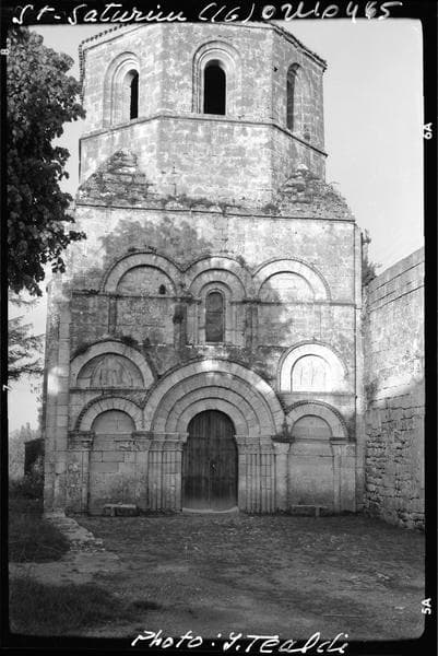 Eglise signalée dès 1110. Elle fut remaniée au 15e siècle et reçut des voûtes d'ogives. Restauration en 1870. La nef est précédée d'une travée portant le clocher, au-dessus d'une coupole ovale sur pendentifs. La nef est couverte de voûtes d'ogives avec doubleaux sur colonnes, formerets et liernes. Le choeur est plus étroit que la nef, à chevet droit. A l'ouest du clocher est plaquée la façade de la fin du 12e siècle, à trois étages. La porte d'entrée occidentale est à quatre voussures, sur colonnes aux tailloirs à multiples voussures s'étendant en frise. Chapiteaux sculptés. Un cordon de pointes de diamant entoure le tout. Au-dessus, deux arcs sont portés par un cordon à dents de scie, renfermant deux tympans remployés, représentant un saint personnage offrant une couronne à un évêque pour l'un ; le Christ bénissant entre la Vierge et saint Jean pour l'autre. Le dernier étage est décoré de trois arcades, celle du milieu étant ajourée d'une fenêtre. Elles sont entourées de dents de scie sur colonnettes.