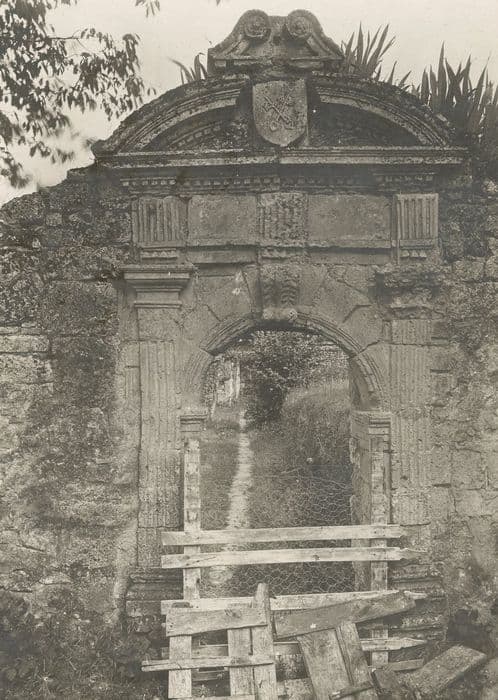 Cette porte, de la fin du 17e ou du début du 18e siècle, se compose de trois arcades en plein cintre. Elle est flanquée de deux pilastres doriques, surmontés d'un entablement à trygliphes et couronné d'un fronton courbe. Un écusson portant deux clefs croisées orne le fronton.