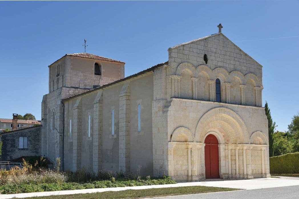 Eglise dépendant de l'ancien diocèse de Saintes, construite au 12e siècle. Elle servit de forteresse pendant les guerres de Religion. Restaurée aux 17e et 19e siècles. Plan rectangulaire à une seule nef couverte par un berceau en briques creuses construit en 1911. Le transept est couvert d'une coupole sur pendentifs. Le choeur et l'ancienne abside au chevet droit ont été détruits. Des vestiges semblent indiquer qu'il existait au nord une chapelle. La façade occidentale est ouverte par un grand portail à quatre voussures plein cintre (feuillages entrelacés, fleurs à huit pétales, étoiles). Les colonnes ont disparu. Deux portes aveugles accompagnent le portail. Les tailloirs des colonnes se prolongent, formant tympan. A l'étage, au-dessus, une corniche de godrons porte cinq arcatures plein cintre avec colonnes doubles. Le tout est orné d'un bandeau de pointes de diamant. Clocher carré sur le transept, dont seule la base est ancienne.