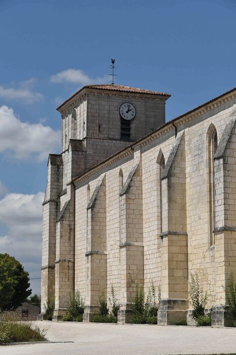 Eglise d'origine romane, donnée en 1107 à l'abbaye d'Ebreuil qui l'unit à son prieuré Saint-Léger-de-Cognac. Détruite pendant les guerres de Religion, elle fut reconstruite au 17e siècle. D'importants travaux eurent lieu au 19e siècle (charpente, corniche, voûtes, portail...). L'édifice forme un long rectangle de contreforts. Ce vaisseau se rétrécit à l'ouest, à l'emplacement du clocher-porche. Il s'agrandit au nord d'une chapelle rectangulaire à hauteur de la troisième travée de la nef. Une sacristie est accolée au chevet plat. Sur un portail en cintre brisé couronné d'un gâble et d'un oculus, l'étage du clocher est orné de colonnettes adossées entre un bandeau et une corniche sur modillons. Le clocher-porche est voûté de croisées d'ogives à quatre quartiers. La nef et le choeur datent du 19e siècle.