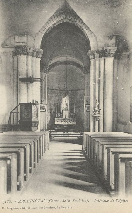 Nef et façade modernisées. Le carré du transept est couvert d'une coupole retombant sur quatre piles romanes. Il est surmonté du clocher carré roman. L'abside est de style roman poitevin.