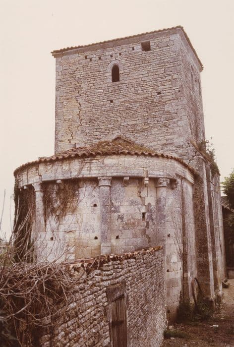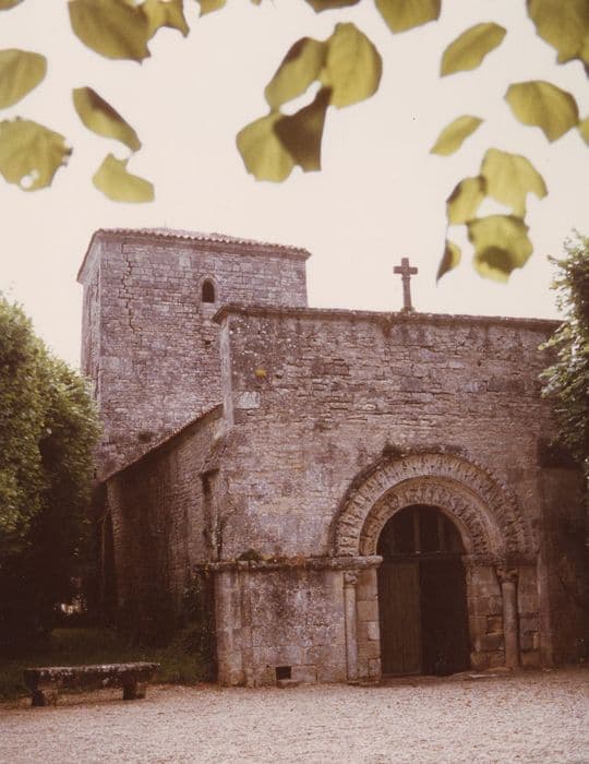 De l'église primitive de la fin du 11e siècle, il ne resterait que la partie inférieure de la façade, le chevet et, à l'intérieur, les chapiteaux à l'entrée du choeur. L'empreinte de la fin du Moyen Age apparaît au clocher massif, aménagé aux 14e puis 16e siècles en corps de garde et qui servit de forteresse. L'église romane a peut-être été victime des guerres de Cent ans et de Religion. La voûte en pierre a disparu. Les murs latéraux et la partie supérieure de la façade ouest sembleraient avoir été édifiés au début du 17e siècle. Les différences d'appareillage laissent voir ces remaniements. Le plan de l'église est simple et a dû rester, dans l'ensemble, fidèle au plan initial : une seule nef, une abside circulaire, le clocher à la jonction, entre la nef et l'abside. Le portail occidental offre une grande variété de thèmes iconographiques. Une seule colonne figure à chaque piédroit du portail. Elle est surmontée de chapiteaux sculptés d'animaux mythiques. Au cordon d'archivolte apparaît un programme divers. La voussure externe présente une succession de S à l'endroit et à l'envers, ornés de fines perles, se réunissant en haut et en bas en une palme de feuillage. La voussure interne porte des sphinx à tête barbue, des équidés, des dragons et des sortes de basilics. Le clocher massif a été fortifié à la fin du Moyen Age. A l'intérieur, la nef ayant perdu sa voûte, a été recouverte d'un lambris en berceau surbaissé.