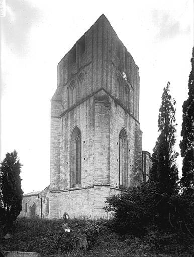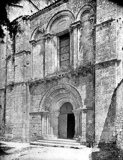 A l'origine, l'église avait deux nefs, l'une, la seule existante, étant attribuée aux religieux. La façade romane est marquée par le style du 12e siècle. La porte est encadrée de quatre voussures sans ornements, supportées de chaque côté par autant de colonnes surmontées de chapiteaux et d'une archivolte d'entrelacs. Un rang de corbeaux la sépare de trois arcades avec chapiteaux. A gauche de cette façade se trouve le clocher carré, de style 13e ou début du 14e siècle. Il n'a jamais été achevé et s'élève à peu près aux deux tiers de la hauteur qu'il aurait dû avoir. La porte s'ouvrant à sa base permettait aux fidèles d'entrer dans leur nef, aujourd'hui détruite. Au-dessus de cette porte se trouve, sur deux faces, une grande fenêtre avec trumeau central.