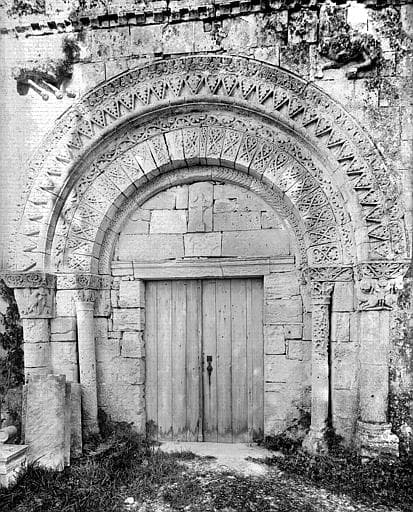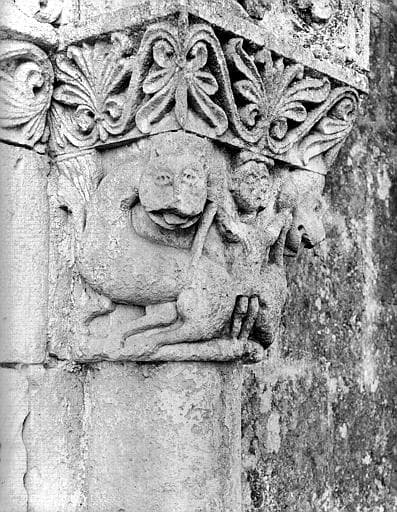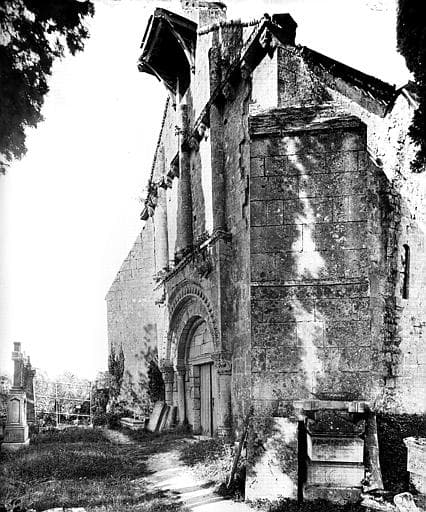 Nef romane, autrefois voûtée, maintenant couverte d'un plafond. La dernière travée conserve des demi-colonnes avec arrachements d'ogives de style flamboyant. Quatre chapiteaux romans (trois à décor floral, le dernier à deux personnages tenant chacun un grand serpent). Façade romane du 12e siècle. Voussures ornées de palmettes, entrelacs... Clocher-arcade. Contreforts de style gothique flamboyant.