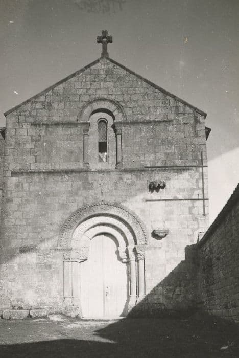 Eglise du 12e siècle dont les murs ont été en partie remontés. Elle a été flanquée postérieurement, sur sa façade nord, d'un gros clocher carré, percé sur chaque face de deux baies en plein cintre. L'entrée se fait par un portail roman à trois voussures, supportées de chaque côté par trois colonnes aux chapiteaux sculptés (chimères, rinceaux, tête humaine...). Les voussures sont également ornées d'un décor floral et de feuillage. Au-dessus de ce portail, une fenêtre en plein cintre est encadrée de colonnes aux chapiteaux de feuillages. Au pied de cette façade, deux bases servaient de support à deux colonnes qui encadraient autrefois la façade. A droite du portail, un dais du 15e siècle devait autrefois abriter une statue. L'intérieur conserve également des chapiteaux sculptés.