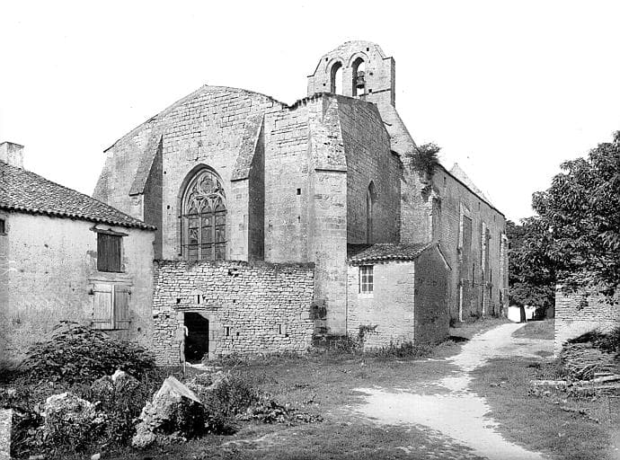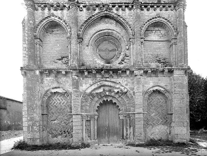 Nef et façade date du 12e siècle. Le choeur remonte au 14e siècle. La façade est surmontée d'un grand fronton nu et comporte deux étages de portiques à arcs romans à ogive. Le portail comporte plusieurs voussures à claveaux sculptés. Celle du bas retombe sur des colonnettes à chapiteaux ornés de feuillages et de figures. Les portails latéraux sont remplis par un opus à fougère. Un campanile surmonte l'arc d'entrée du choeur. Il était autrefois à deux étages. L'escalier à vis qui mène sur les voûtes esst pris dans l'épaisseur de la muraille. Il offre la particularité d'être protégée, dans sa partie supérieure, par une petite chambre de défense.