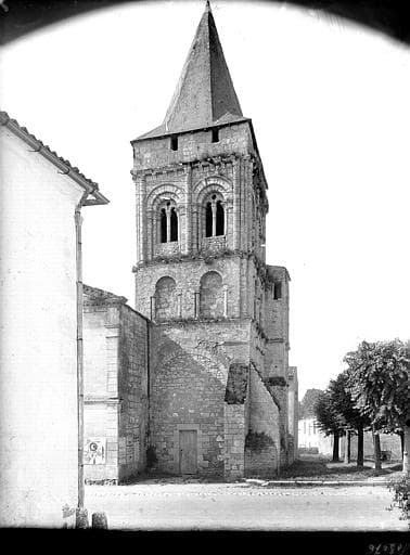 Le clocher est le vestige d'une grande église romane détruite pendant les guerres de Religion. Il a été en partie dérasé lors de l'incendie de l'église, puis transformé en tour fortifiée et surmonté, au début du 16e siècle, d'une flèche en charpente recouverte d'ardoises. Il est accolé à une église du début du 19e siècle.