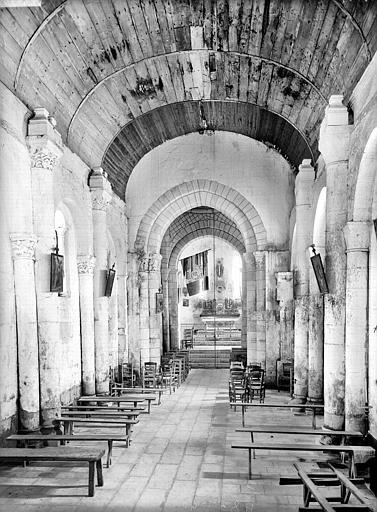 L'abside est ancienne, voûtée en pierre et décorée d'arcatures. La croisée du transept et la nef ont été complètement remaniées. Cette dernière comprenait six travées. Puis, piles et arcades sont venues séparer la nef des collatéraux. Les murs latéraux présentent encore l'ordonnance des anciennes travées et ont conservé tous les éléments de l'architecture du 12e siècle (baies, colonnes et chapiteaux sculptés, ainsi que le bandeau marquant le départ des voûtes).