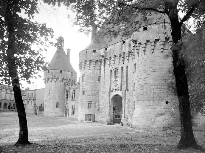 Tours, poterne et fontaine du sous-sol : 17e siècle ; Salle de théâtre : 3e quart 19e siècle. De l'ancien château féodal, il ne reste plus que la poterne et une tour isolée, reliée au corps principal par une grande salle. Le fossé devant le pont-levis a été comblé pour permettre la communication de la place publique aux bâtiments de l'hôtel de ville et de la sous-préfecture. Les tours flanquant la poterne ont conservé leurs défenses. A chacune, les archères ont été conservées ou agrandies. Des escaliers de pierre desservent chaque étage et accèdent au chemin de ronde. Ce passage semble avoir été découvert, comme en témoignent les gargouilles. Le crénelage comporte mâchicoulis avec archères au milieu des merlons. La fontaine située au sous-sol de la sous-préfecture, présente une niche et un encadrement de niche ornés de sculptures imitant des stalactites. Masque sculpté. La fontaine a probablement été édifiée par Léon de Sainte-Maure, comte de Jonzac, qui agrandit et embellit le château au milieu du 17e siècle. Dans une ancienne cour de servitude du château, un théâtre a été construit au 19e siècle, le plan définitif ayant été approuvé en 1861. Il s'agit d'un édifice en rond de 300 places environ. Deux étages sont aménagés en loges. Les cloisons des couloirs et galerie délimitant les loges ont été supprimées vers 1950. Les travaux de peinture et de décoration de la salle, ainsi que les décors, devaient être confiés à M. Betton, décorateur du théâtre français de Bordeaux.