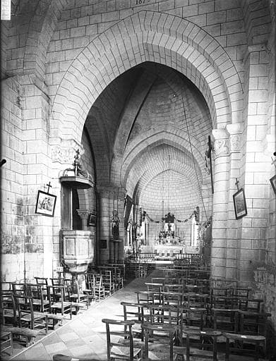 Nef à deux travées, voûtée d'ogives. Transept du 19e siècle. Choeur voûté en demi-coupole.