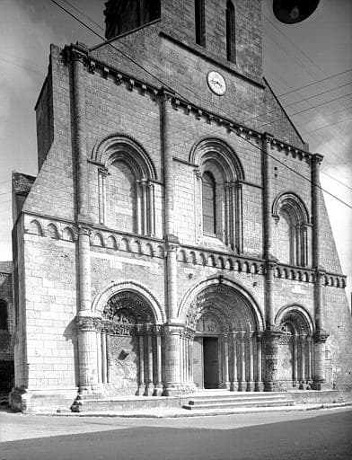 La façade médiévale se compose d'un portail central à cinq rangs d'archivoltes et de deux arcades aveuglées par un appareil en bâtons rompus. Les archivoltes sont décorées de nombreuses figures. Sur le tympan, scène de crucifixion. Dans les tympans des portails latéraux, crucifiement de saint Pierre et saint Pierre délivré de la prison. Les colonnes sont imbriquées ou cannelées.