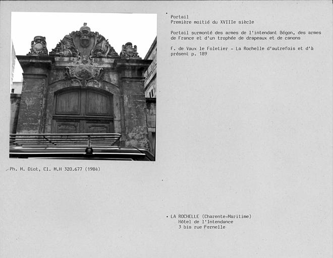 La partie de l'hôtel de l'Intendance concernée par la demande de protection fut construite à partir de 1746 sous la direction de l'architecte de la ville Gilles Nassivet ainsi que de l'ingénieur Gendrier. En effet, à la suite de la séparation des postes d'intendant de la marine et de la généralité en 1717, l'intendant part exercer ses fonctions à la Rochelle et, en, 1729, la ville acquière une maison rue Pernelle et la transforme en hôtel de l'Intendance.£Trois travées horizontales marquées de limites par des bandeaux plats ainsi qu'une série de travées verticales, structurent l'ensemble. Les baies sont toutes dotées d'une agrafe à la clé, sculptée, de style rocaille. A l'intérieur, les différents étages sont accessibles par un escalier en bois muni d'une rampe en fer forgé. Le rez-de-chaussée abritait le cabinet d'audience et son antichambre ainsi que le bureau de l'intendant. Les pièces sont couvertes de lambris et de boiseries sculptées d'arabesques. Il subsiste des boiseries ainsi qu'une cheminée de pierre dans la chambre de l'intendant située au premier étage. Les autres pièces étaient occupées par l'intendante et le personnel de maison. L'immeuble est bâti sur des caves voûtées en appareil de pierre de taille.