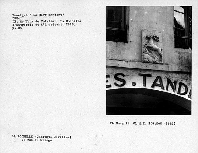 Sur la façade, enseigne en bas-relief, représentant un cerf grimpant sur une montagne, avec l'inscription "Le serf montant".