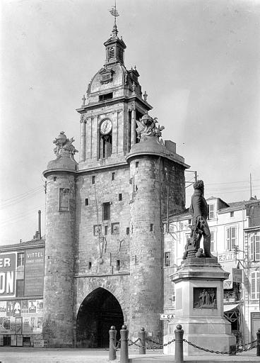 Cette porte faisait autrefois communiquer la vieille ville avec le port. Elle appartenait à l'enceinte intérieure qui protégeait les Rochelais contre les incursions possibles venues de la mer. Sa construction remonte au début du 14e siècle. Elle subit, à partir du siècle suivant, de nombreuses restaurations jusqu'au 18e siècle. Puissante construction quadrangulaire dont les arêtes, vers le port, sont amorties en tourelles à l'origine crénelées puis coiffées, au 15e siècle, d'un faîtage conique à tuiles imbriquées. Si l'édifice a conservé, dans ses parties basses, son allure médiévale malgré le percement, au niveau du rez-de-chaussée, d'une arche en tiers-point construite en 1672 par l'architecte Moyse, il n'en est pas de même pour les parties hautes datant de 1744-1746. Le beffroi est percé d'une arcade en plein cintre sur chaque face. Des pilastres jumelés d'ordre ioniques sont plaqués sur les façades tournées vers le port et la ville, tandis que des colonnes surmontées de chapiteaux ioniques décorent les petits côtés. Un entablement à corniche débordante couronne cette partie inférieure. Au-dessus, un attique reçoit un dôme coiffé d'une lanterne percée de quatre arcades ornées de pilastres couplés d'ordre composite. Chacune des deux tourelles anciennes qui flanquent la tour médiévale côté port, est couronnée de trophées représentant des allégories astronomiques et maritimes.