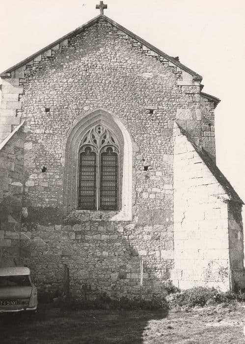 Du 12e siècle, l'église n'a conservé de sa construction primitive que sa façade, une partie de sa tour d'escalier et une cuve baptismale. L'édifice est à nef unique et clocher carré. La façade s'ouvre par un portail à trois voussures séparées par des cordons de pointes de diamants et d'entrelacs. La partie supérieure des colonnes soutenant les voussures, est ornée de torsades. Deux motifs géométriques séparent les colonnes des voussures, ainsi que le rez-de-chaussée du premier étage constitué d'une série de cinq arcatures. Le tout est surmonté d'un pignon.