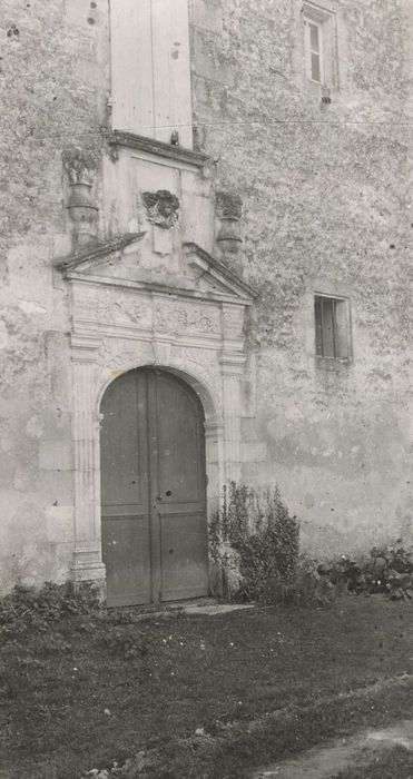 Logis du 17e siècle ayant remplacé un château plus ancien dont il reste une grosse tour à l'angle sud-ouest. Le corps de bâtiment central s'ouvre par une porte Louis XIII. Cette porte à arc surbaissé est encadrée de pilastres cannelés, avec écoinçons ornés de feuillages. La frise qui les surmonte est formée de rinceaux de feuillages et, au-dessus des pilastres, de feuilles d'acanthe. Un fronton brisé surmonte le tout, portant en son centre un écusson écartelé, surmonté d'un casque de face avec des lambrequins.