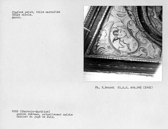 Donjon : 2e moitié 12e siècle ; Hôtel de Ville : 17e siècle ; Les deux plafonds peints : 3e quart 17e siècle. Le château semble exister depuis le 10e siècle. Geoffroy III, seigneur de Pons, le reconstruit (donjon). Au 13e siècle, la ville s'organise autour de l'édifice, entourée de remparts (achevés vers 1230). Devenu un fief huguenot, Pons est assiégé et attaqué en 1570 et 1574. En 1598, devenu place de sûreté, Pons va recevoir une nouvelle fortification autour du donjon et les gouverneurs vont reprendre les remparts existant. En 1621, la ville se rend et le démantèlement de toutes les défenses est ordonné. Le château est en partie rasé. De 1623 à 1670, des travaux sont entrepris pour remonter le château arasé de ses tourelles et courtines. Un édifice étroit fut construit à l'aplomb de la falaise, sur la base des remparts et des anciennes caves, étressillonés par de grandes arcatures. A l'intérieur, deux salons conservent leurs plafonds peints. Dans la tourelle sud, une petite salle est ornée de Vénus sur un char tiré par un couple de tourterelles, avec amours dans les écoinçons. Plafond à caissons peints dans la gande salle de rez-de-chaussée.