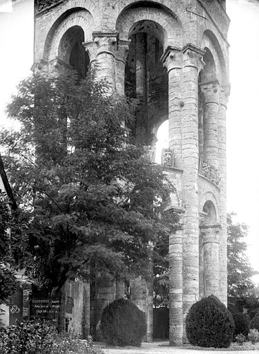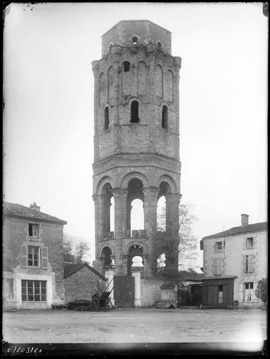 Extrêmement florissante au Moyen-âge, dévastée au cours des guerres de Religion, diminuée aux 16e et 17e siècles, l'abbaye bénédictine de Charroux fut vendue comme bien national pendant la Révolution. De l'église restait alors le choeur circulaire surmonté d'une tour octogonale, trois nefs, l'étage inférieur de la façade précédée d'un porche percé de trois portes et dominé par une tour carrée. Par la suite, ces restes furent utilisés dans de nouvelles constructions. Il restait également certaines parties des bâtiments abbatiaux.