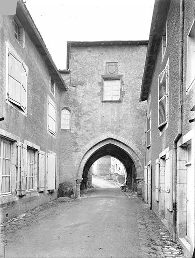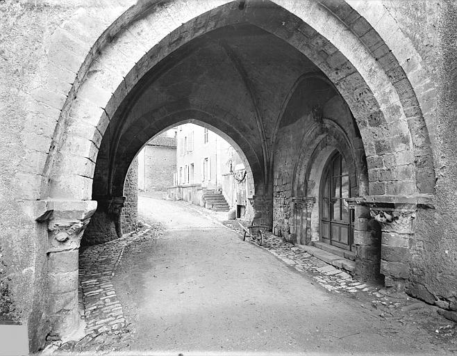 Porte du 13e siècle. A chaque extrémité du passage se trouve un arc à trois rangs de claveaux. Celui du bas retombe sur des demi-colonnes dont les chapiteaux sont à crochets. Le passage est voûté d'arêtes à nervures et percé d'une porte en arc brisé à colonnettes. Chaque façade est percée d'une fenêtre du début du 16e siècle, l'une d'elles étant surmontée d'un écusson. Au-dessus de cette porte, une pièce renferme une cheminée du 15e siècle, à colonnettes, dont le manteau mouluré porte un arc dans le tympan duquel se trouve un écusson armorié.