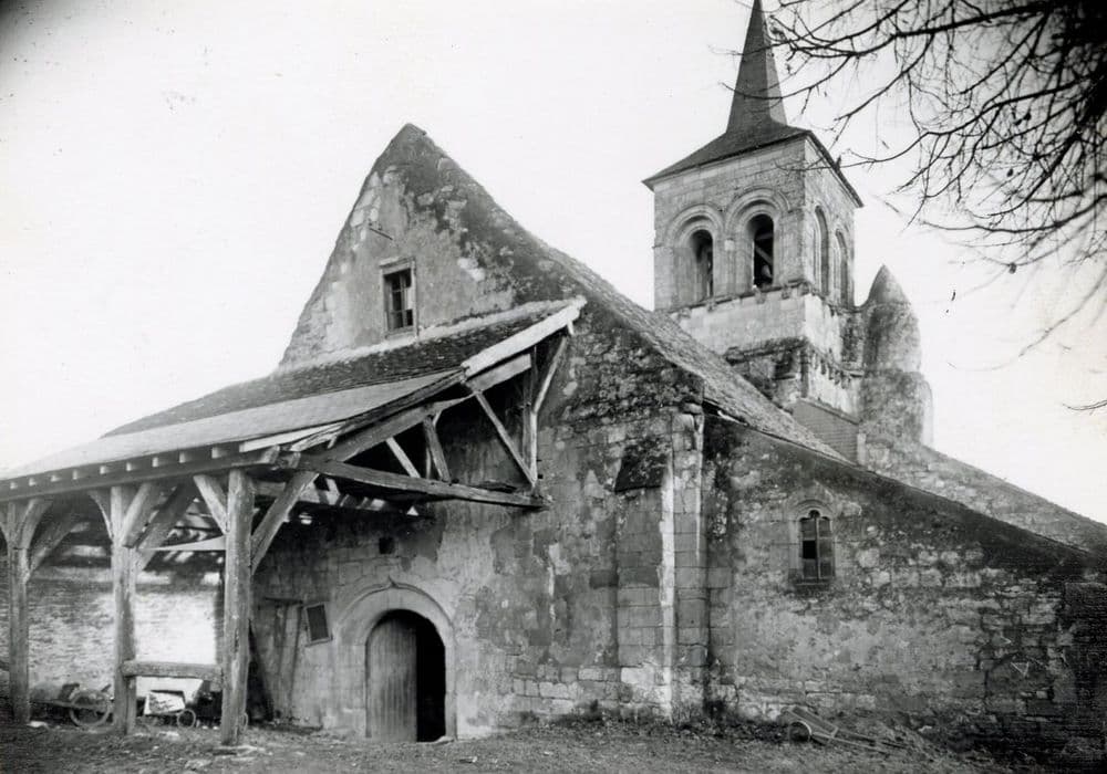 Un texte de 892 mentionne l'édifice. La cure est à la nomination du chapitre de Saint-Martin de Tours. L'édifice est orienté, à nef unique à l'origine et probablement terminé, avec les réfections du 15e siècle, par un choeur à trois absides semi-circulaires dont les amortissements se devinent encore côté nord. La façade à pignon est percée d'une porte en anse de panier surmonté d'une accolade moulurée qui semble dater du 15e siècle. Un grand auvent en bois appuie sur cette façade. A l'ancienne croisée du transept s'élève un clocher dont la touche est romane. Un étage ajouré y a été ajouté, sans doute à la fin du Moyen-âge. A l'intérieur, la nef primitive était sans bas-côtés et sans doute couverte en charpente. De conception massive, le carré du transept se compose de quatre grosses piles carrées contre lesquelles s'appuient des colonnes engagées surmontées de chapiteaux sculptés (têtes humaines, palmettes, sagittaires affrontés, rosette, quadrillage...). Les chapiteaux recevant la retombée des arcatures qui surmontent les passages latéraux donnant autrefois accès aux absidioles, sont également ornés (oiseaux, palmettes, sphinx, lions...). Les arcs plein cintre encadrent une coupole octogonale sur trompes. Le choeur a été refait à l'époque gothique.