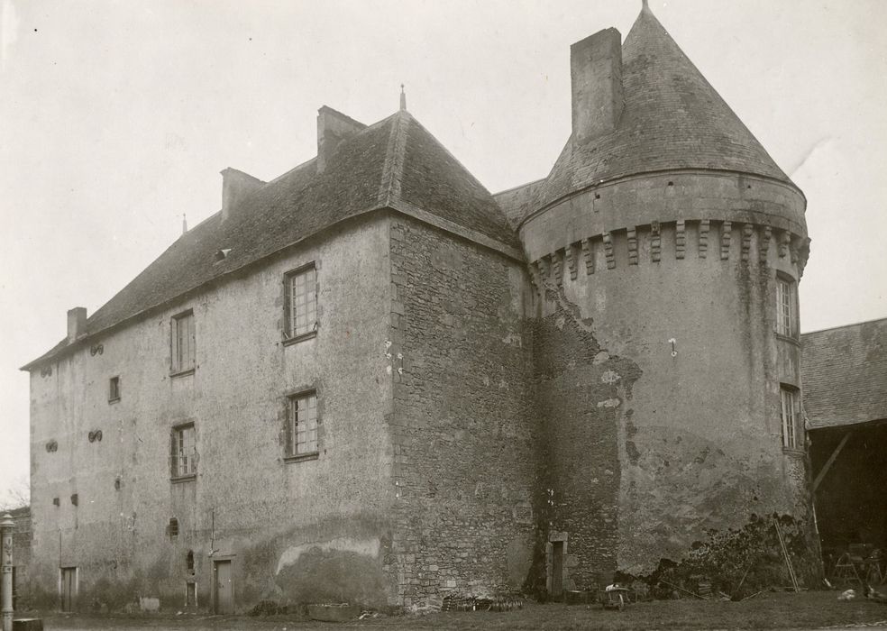 En 1489, le propriétaire reçut l'autorisation du roi de fortifier son manoir. Au 17e siècle, un deuxième édifice fut construit à l'ouest, entre deux tours de l'enceinte. Le château du 15e siècle fut endommagé au cours de la Seconde guerre mondiale et rasé peu après. Seul le bas-relief sculpté avec armoiries de la double porte d'entrée fut récupéré pour être apposé sur la façade du logis du 17e siècle. Ce bâtiment, composé d'un rez-de-chaussée et d'un étage, est toujours encadré par les deux tours de l'enceinte médiévale qui ont conservé quelques éléments défensifs. Les lucarnes du toit ont été reprises en 1844.